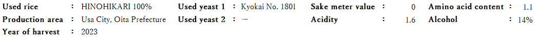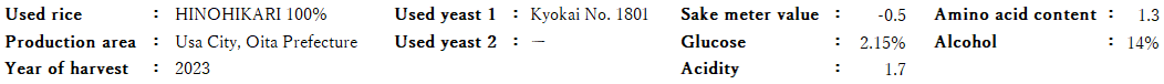 To take advantage of the characteristics of Hinohikari grown in Usa, a grain-growing region in Oita Prefecture, it is important to bring out sourness and sweetness in a well-balanced manner when brewing sake. We used high-potency koji (rice malt) to control the activity level of yeast and saccharification of koji and pressed the rice at an alcohol content of 14%.