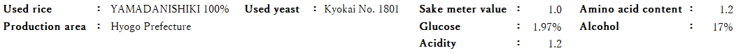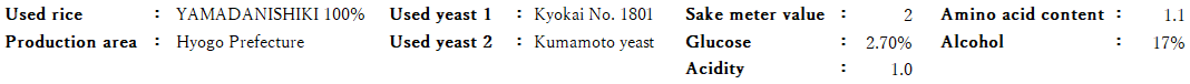 We blended the raw sake of “Kyokai No. 1801 Yeast” as a base (97.1%) with the raw sake of each year meticulously at 0.45-0.98% and achieved the blend giving a flavor and deep taste, particularly with a pleasant aftertaste without bitterness.