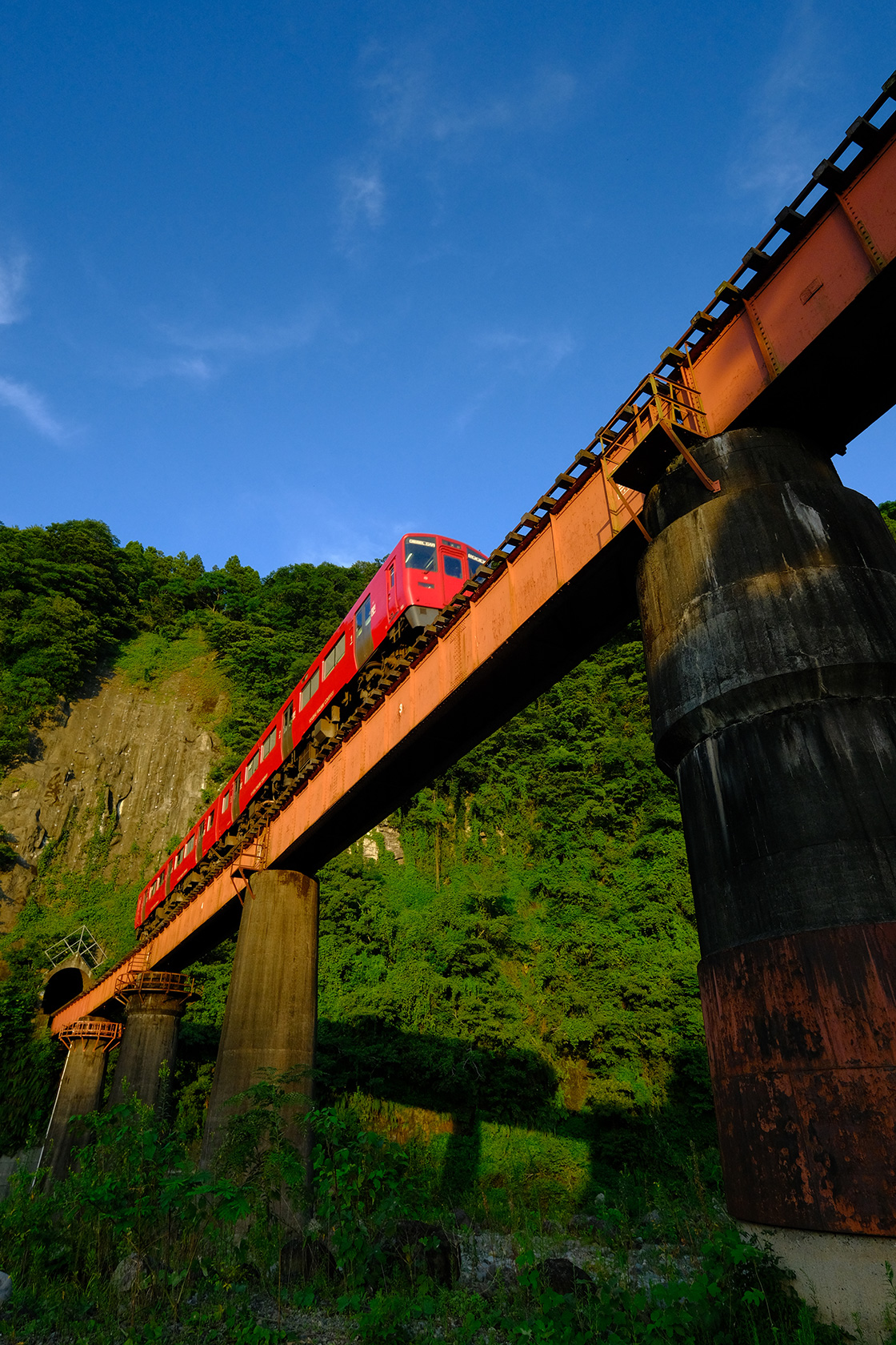 大分は鉄道橋も魅力的だ。SL時代からJR九州の豊肥本線には鉄道ファンを魅了し続けてきた鉄橋が多い。中でも豊後清川駅と三重町駅の間にある百枝鉄橋(岩戸鉄橋)は「岩戸の景観」と呼ばれるほど有名だ。絶壁に架かる赤い橋は、鉄道がもっとも輝いていた時代の力強さがみなぎっていた。その美しさに魅了され日没まで撮影した。黄昏時に半月が昇るとき、列車がやって来た。月光に照らされた列車が橋を渡るとき、夢の中の銀河鉄道のようだった。