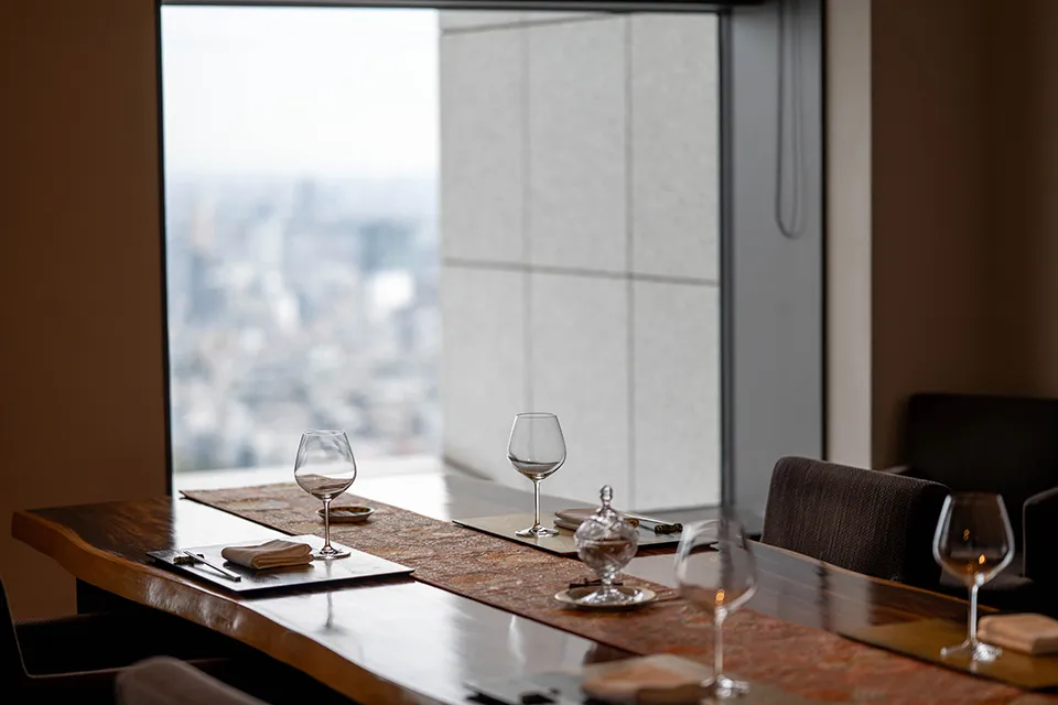 「一味真」店内。夜は窓からの都心の夜景も美しい