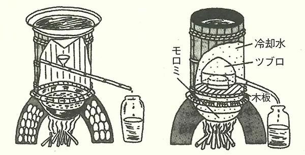 上図の左側の蒸留器は、釜に発酵もろみを入れ、釜の下から直火で加熱。甑上部に冷却用の水をたたえた別の釜を乗せ、蒸発し上の釜に触れて液化した蒸気を、管を通して外の器へと導くのです。上部に乗せる釜が「兜(カブト)」に似ていることから、この蒸留器は「カブト釜式」と呼ばれています。