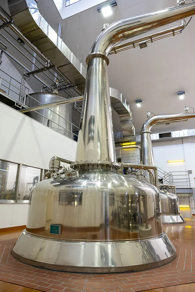高級な蒸留酒として知られるモルトウイスキーは、発酵形式が「単行複発酵」で、糖化後、ろ過した清澄な麦汁に酵母を加えて発酵させます。蒸留前のもろみ(ウオッシュ)のアルコール濃度は7〜8%前後。それを単式蒸留機で1回蒸留すると20~21%の初留(しょりゅう)液が得られます。