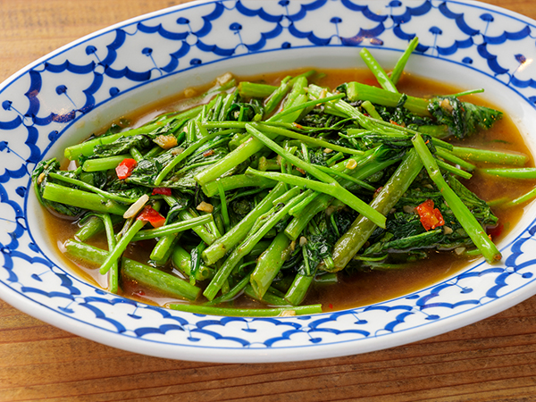 オイスターソースが決め手になるのは青菜炒め。今日はタイでもよく食べられている空芯菜(くうしんさい)を使います。春なら菜の花でもいいですね。空芯菜は夏野菜ですが、このところ、通年売っていたりします。唐辛子は、今日は生のものを使いましたが、干したものでもいいし、青唐辛子でもいい。