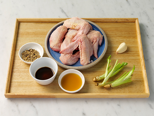 唐揚げ用の皮付きのもも肉でもいいですが、今回は手羽先を使います。やっぱり肉は骨付きが美味しいから。また、部位の違う肉を2種類ぐらい使うと、見た目も楽しいかも。