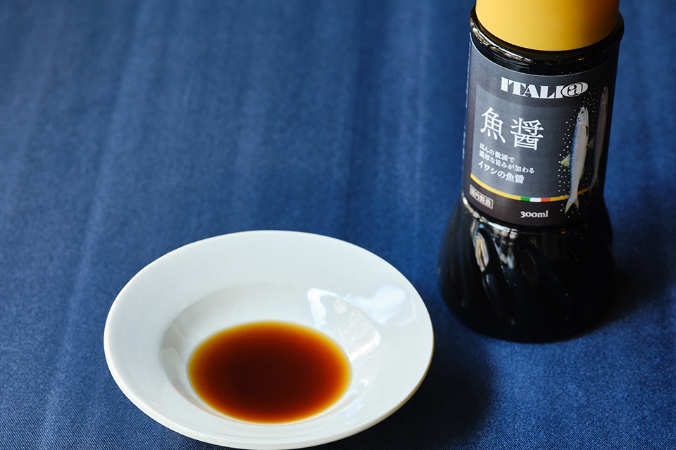 タイの「ナンプラー」や、ベトナムの「ニョクマム」も同じ魚醤の仲間ですが、イタリアにも魚醤があるんです。日本で最初に広く知られるようになったのは、「コラトゥーラ・ディ・アリーチ」。南イタリアの伝統的調味料で、カタクチイワシと塩を使い、熟成・発酵させたものです。カタクチイワシはアンチョビの原料でもありますが、長期熟成することで薄口醤油のような色合いになり、上品な香りとコクが生まれます。